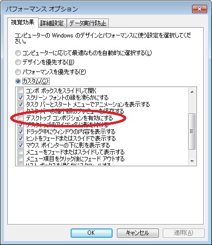 2:Windowsの視覚パフォーマンスを調整した 具体的には、システムの詳細設定からパフォーマンスオプションで 「デスクトップコンポジションを有効にする」をOFF。