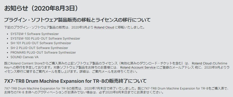 - Roland CloudへLifetimeライセンスを移管する計画はある(時期は未定)
