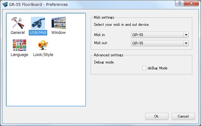 マニュアルを読むとこのソフトはMIDI経由でGR-55とのデータのやり取りを 行うみたいなので MIDI-IN/OUT を GR-55 に設定。