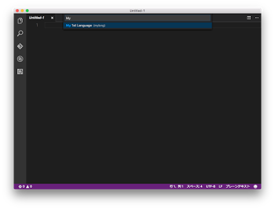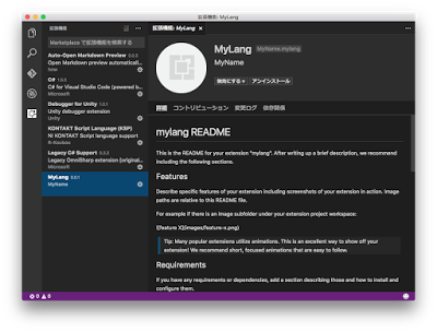 この時点で「何もしない空っぽの拡張機能」が出来上がっていますのでVS Codeを起動し、拡張機能を見てみます。 下図のように「拡張機能 MyLang」が一覧にあるはずです。